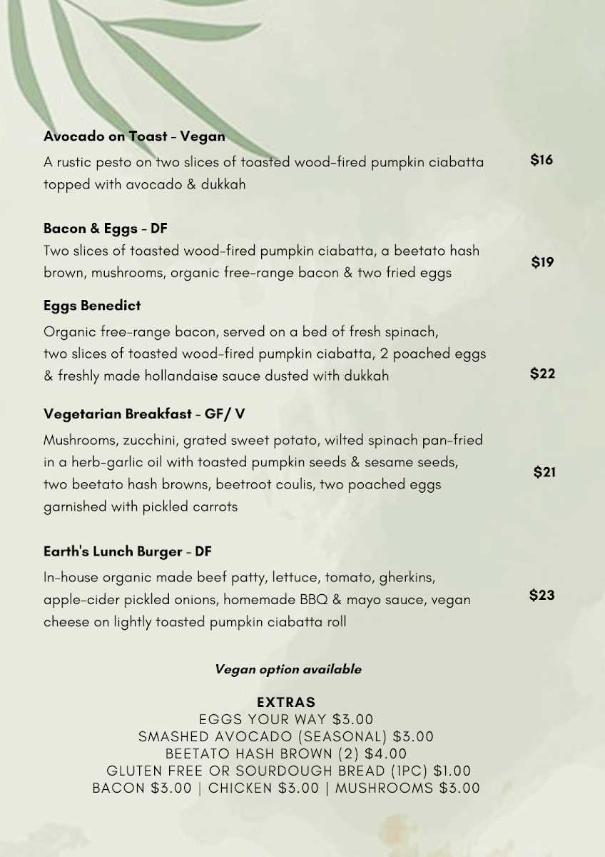 Organic free-range bacon, served on a bed of fresh spinach, two slices of of toasted wood-fired pumpkin ciabatta, 2 poached eggs & freshly made hollandaise sauce dusted with dukkah.